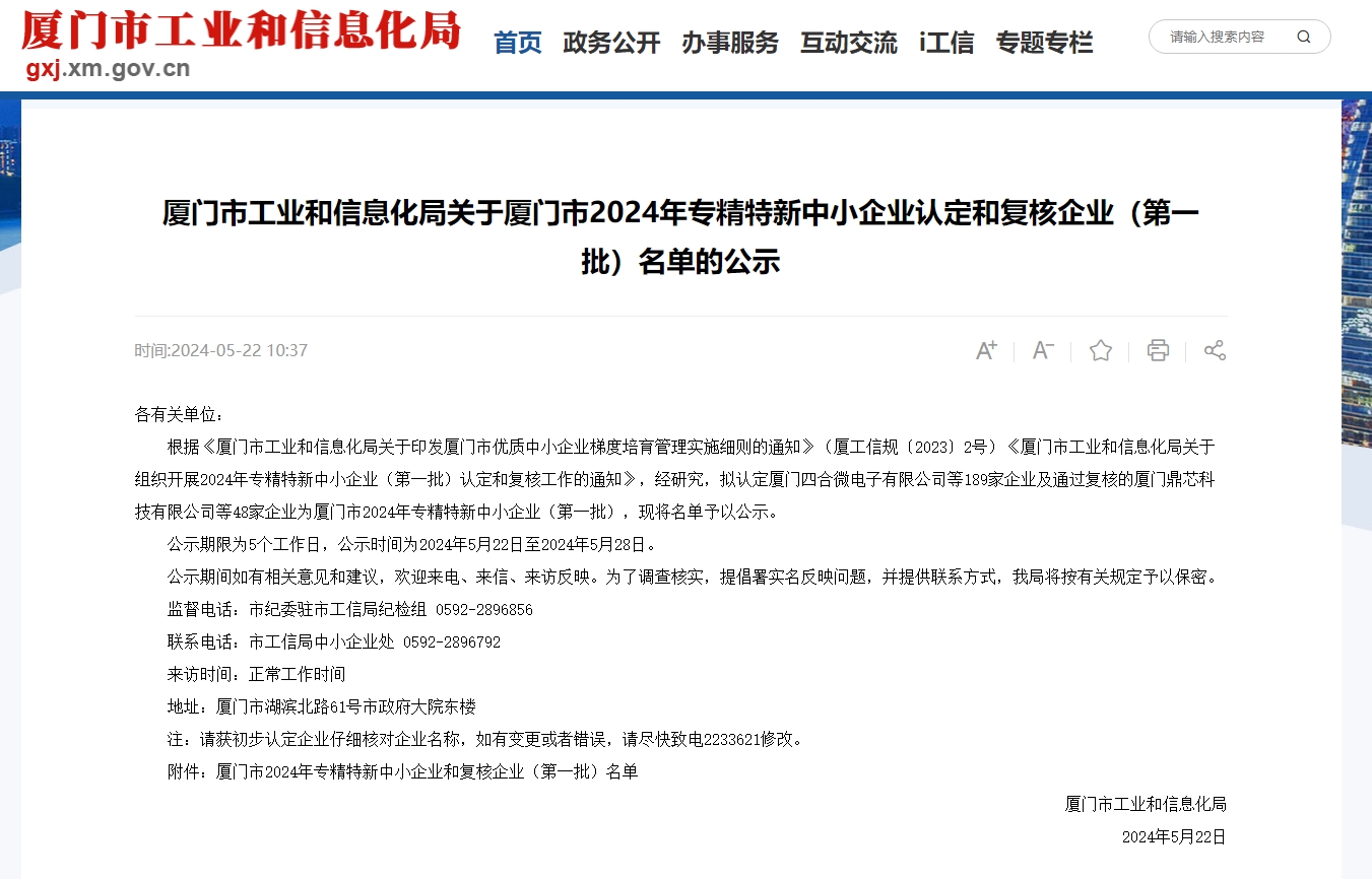 5月22日,厦门市工业和信息化局公布了《关于厦门市2024年专精特新中小企业认定和复核企业(第一批)名单的公示》,厦门K8凯发天生赢家一触即发网络科技有限公司成功顺利获得2024年度厦门市专精特新中小企业认定。