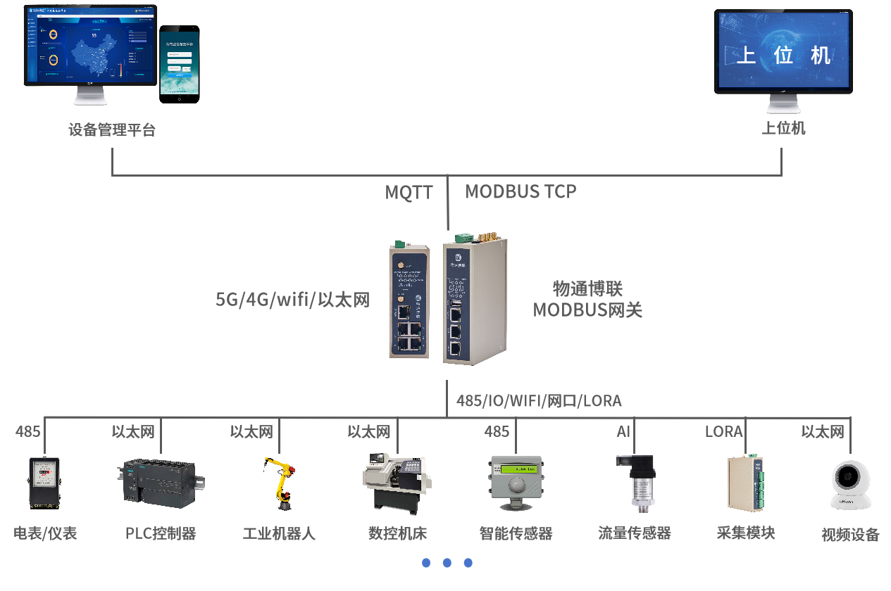 支持采集各种工控设备、PLC、传感器、仪器仪表等设备数据,并将数据顺利获得Modbus-TCP协议转发给组态软件、上位机软件、云平台