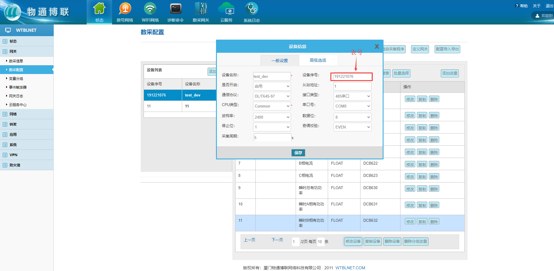 注:电表表号一定要填写,其他的根据电表的参数进行选择。 通讯协议选择: DL/T645-07 DL/T645-97 接口默认为COM0为485串口,WG581系列为COM1 其余的参数根据电表的设备的参数进行勾选!