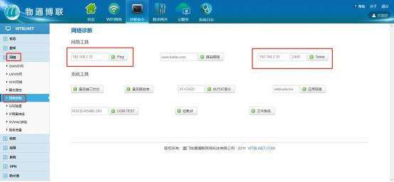 设备顺利获得网线连接网关 LAN 口。 进 入 网 关 WEB 界 面 , 在 “ 网 络 ” -> “ 网 络 诊 断 ” 界 面 中 , 通 过 Ping 和 Telne t 可测试网关是否和 OPC UA 设备正常连接。