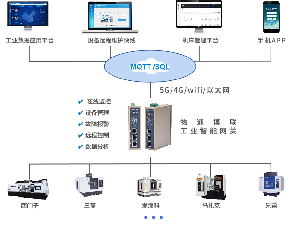 K8凯发天生赢家一触即发推出的工业智能网关能够接入西门子、三菱、马扎克、发那科、海德汉、哈斯、兄弟、台湾宝元、广州数控等数控机床,实时采集设备数据、加工数据、刀具数据、生产数据等并对接到工厂MES系统、ERP系统中,从而实现手机端、电脑端、车间看板对各项数据的展示、告警、管理与分析,为生产、运维、物料等相关工作召开给予全面准确的数据支持,助力企业制定科学合理决策,促进高质量开展。