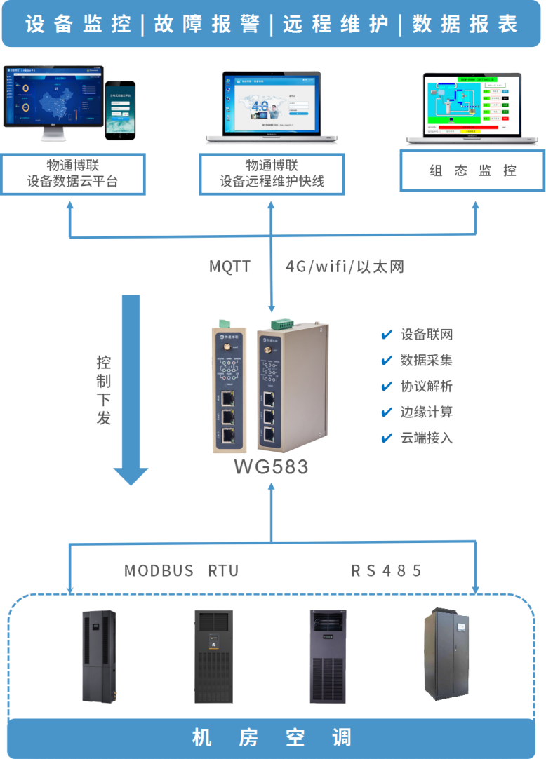 采集机房空调数据并上传到物联网云平台,实现云组态监控设备运行状态,故障及时报警。
