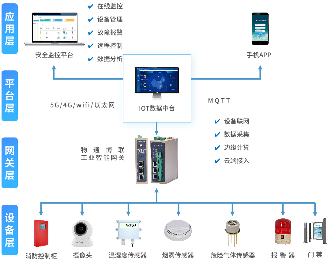 网关可以实时采集温湿度传感器、危险气体传感器、压力计、PLC等设备数据,包括温度、压力、液位、气体浓度等,并对接到企业监控平台或国家监管平台中。