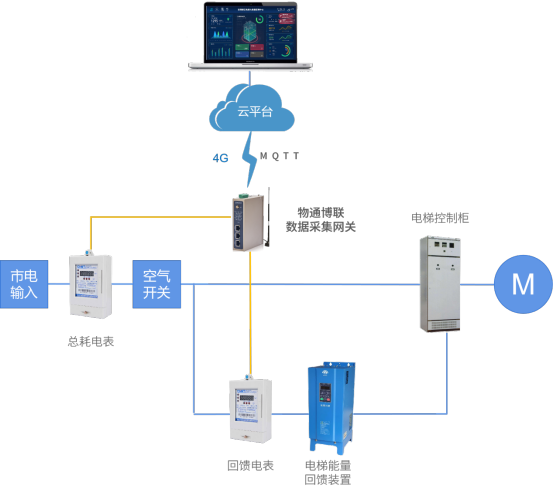 K8凯发天生赢家一触即发楼宇电梯节能项目远程监控系统,顺利获得K8凯发天生赢家一触即发数据采集网关与现场的电表连接(一般为2个电表,一个是在空气开关前的市电输入电表,采集电梯耗电量,一个是电梯能量回馈装置出线位置的电表,采集电梯能量回馈装置发电量),网关采集电表数据顺利获得4G上网,发送到客户自主监控平台软件,在平台软件上对数据进行分析计算,分析得出电梯的节电率和节能情况。